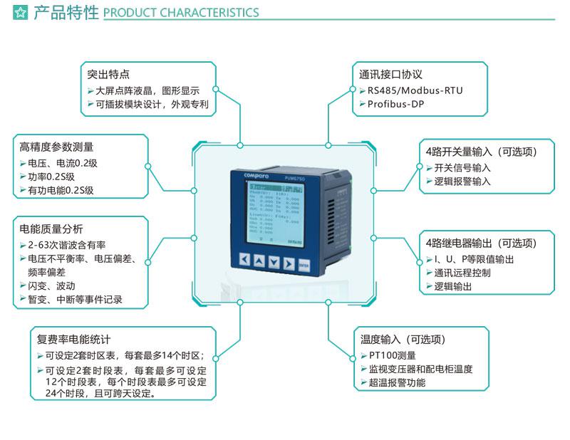 PUMG750是遵循國際電能質量標準而推出的新一代高端電能質量分析儀表,監測所有電能質量參數,如閃變,記錄電壓短時中斷,諧波最高至63次的測量分析。