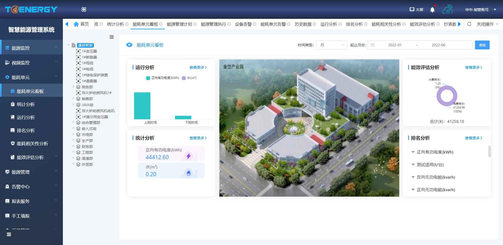 T@Energy智慧能源管理系統(tǒng)對能源使用情況,對設(shè)備運(yùn)行實(shí)行集中監(jiān)測、管理和分散控制。以區(qū)域數(shù)據(jù)為基礎(chǔ),結(jié)合“互聯(lián)網(wǎng)+大數(shù)據(jù)”的有效利用,自由組合成多個“能耗單元”,通過智慧能源綜合管理平臺的實(shí)現(xiàn)能碳管理、能耗分析、單耗指標(biāo)、專家評估、智能預(yù)測等。主要側(cè)重于對水、電、氣、暖的用能分析。大屏展示: