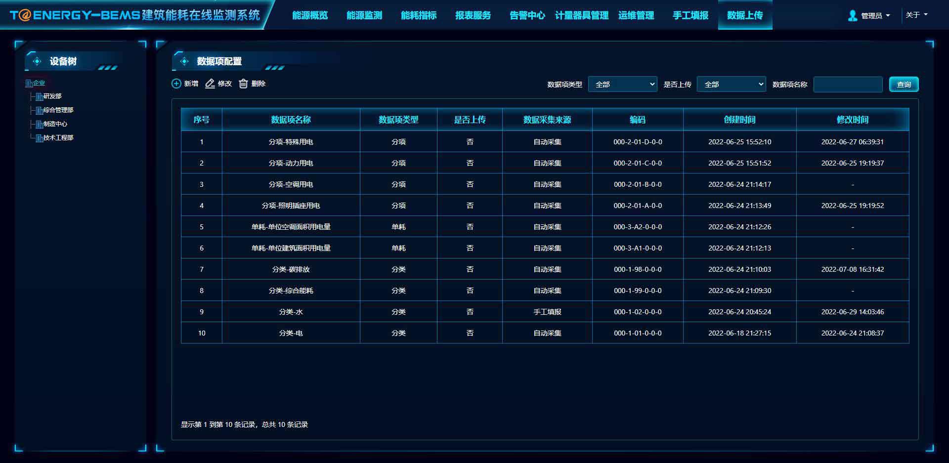 公共建筑能耗監測系統以可視化獨立分模塊的形式展示重點信息,包含有分類能耗統計、分項能耗統計、建筑信息、告警信息、手工填報信息、上傳信息等。