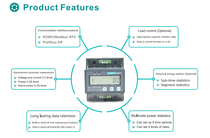 KPM31 single-phase rail smart meter in full compliance with the national standard GB / T7215-2008 and the international standard IEC62053: 2003 on the 0.5S-class energy meter of the relevant technical requirements, it use microelectronic technology and imported large-scale integrated circuits, it also application digital sampling Processing technology and SMT technology and other advanced technology , it can be directly and accurately measure the rated frequency of 50 / 60Hz AC active power, it use LCD7 + 1 bit LCD display, with high reliability, small size, easy installation and so on.