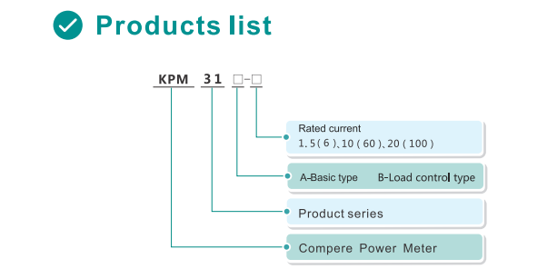 Example: KPM 31A-1.5(6):Rated AC220V /1.5A(Max 6A), basic type multi-rate energy statistics, historical energy statistics single-phase guideway type smart meter.