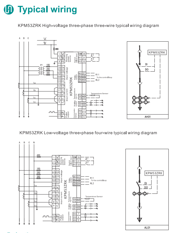 1. The wiring diagram is suitable for high voltage three-phase three-wire system, low voltage three-phase four-wire system, regard to other system wiring please refer to KPM53 instruction manual.