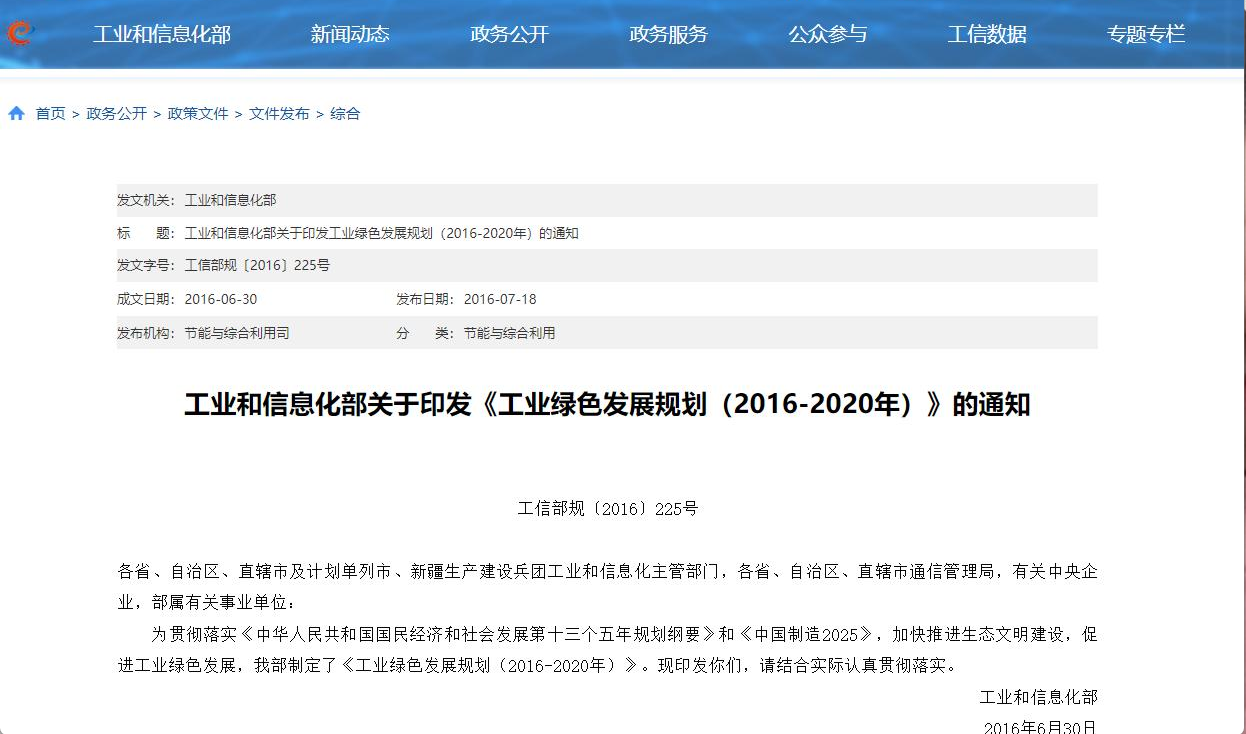 對(duì)此,工信部先后發(fā)布了《工業(yè)綠色發(fā)展規(guī)劃(2016-2020年)》等多份文件,旨在加快推動(dòng)綠色制造體系建設(shè),打造綠色制造先進(jìn)典型,引領(lǐng)相關(guān)領(lǐng)域工業(yè)綠色轉(zhuǎn)型。