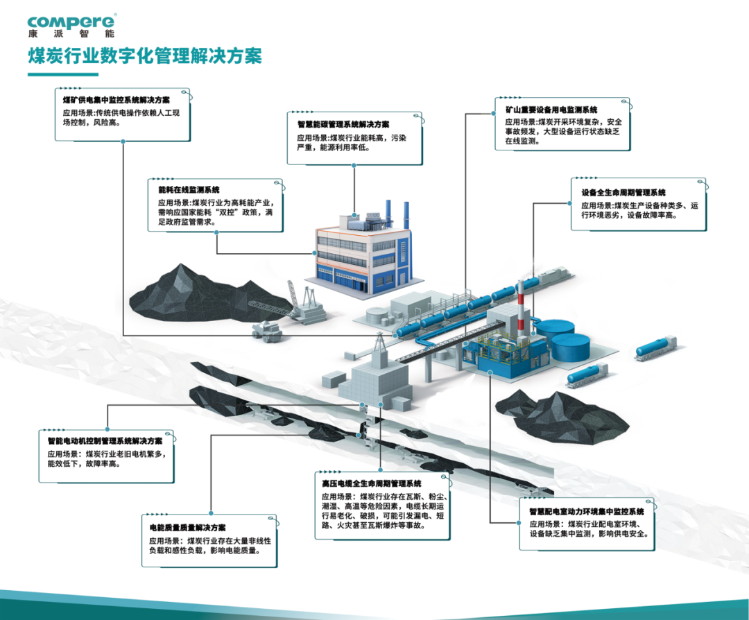 康派智能以能源管理、碳排放管理、設備全生命周期管理、供配電安全管理的數字化解決方案為核心,搭建新型煤炭行業數字化場景解決方案,助力煤炭企業實現能源的高效利用和安全智能運行管理。