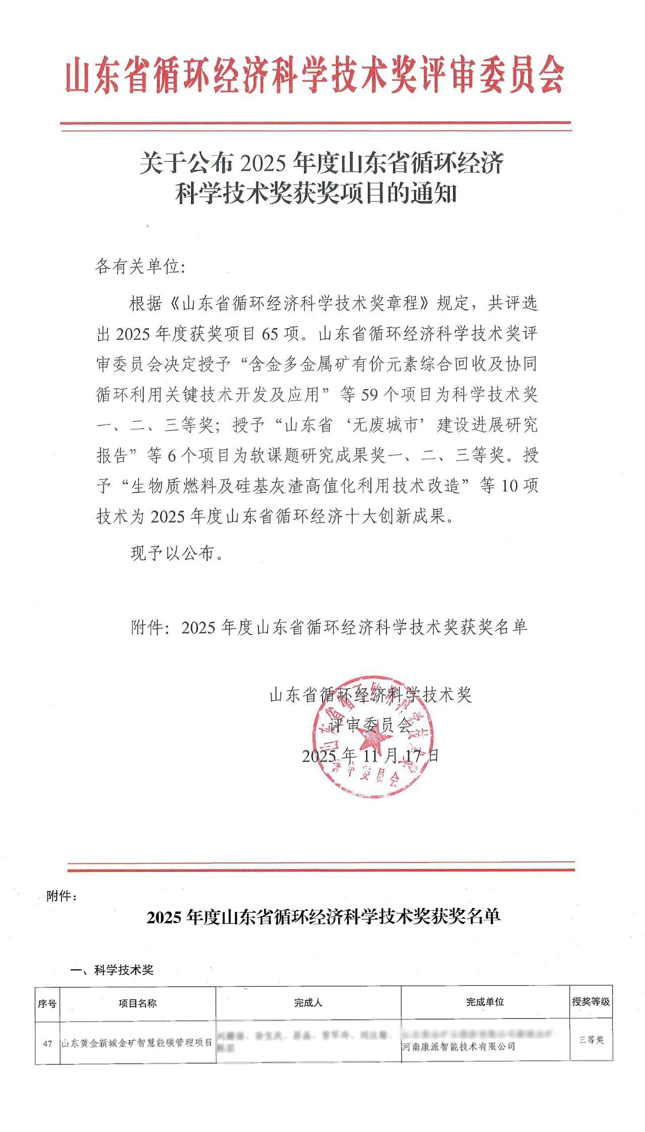 近日,2025 年度山東省循環(huán)經(jīng)濟科學技術獎獲獎結果正式公布,河南康派智能技術有限公司申報的 “山東黃金新城金礦智慧能碳管理項目” 憑借突出的創(chuàng)新實踐與綠色成效,成功榮獲科學技術獎三等獎!