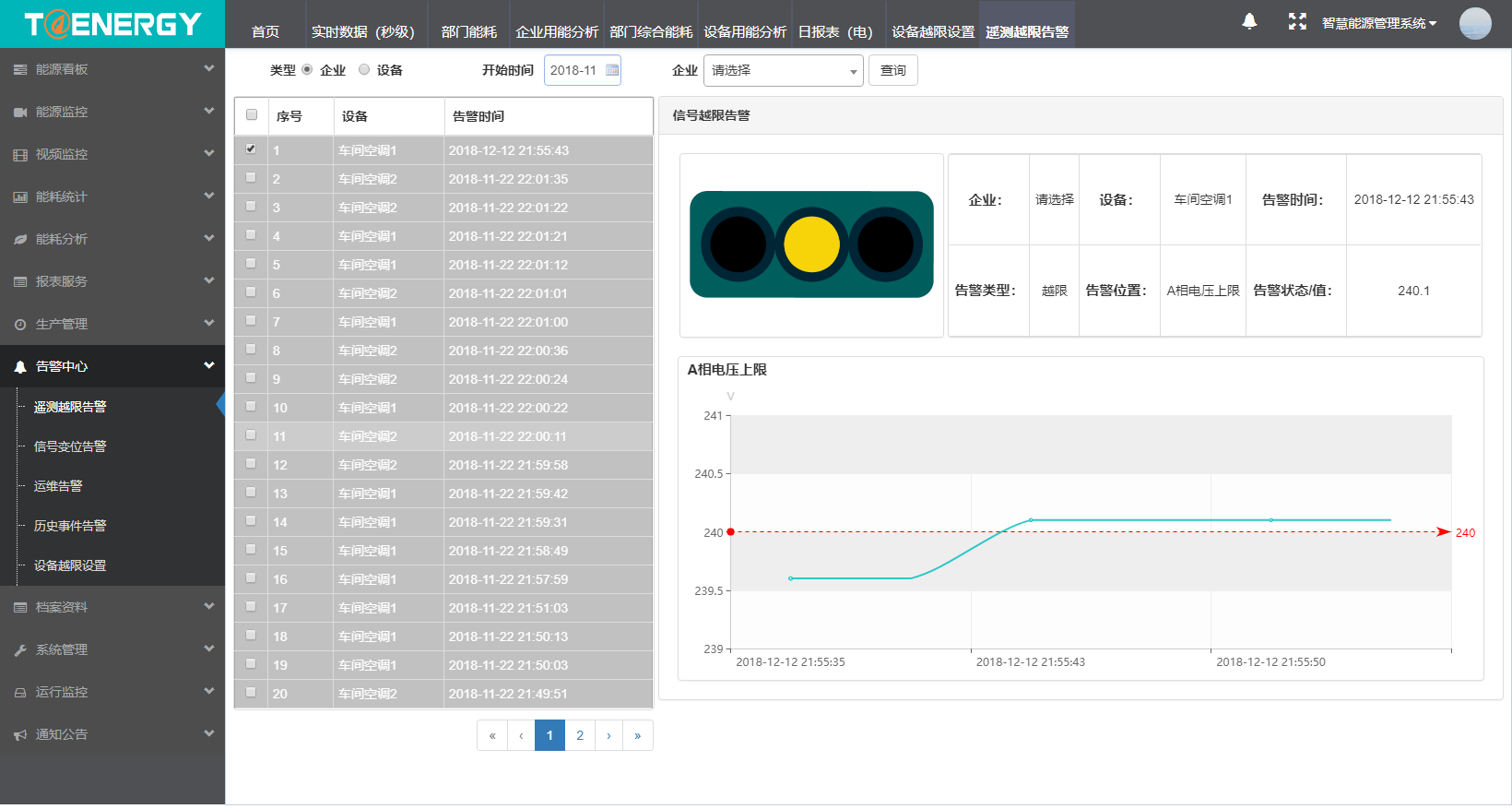 能源管理系統平臺告警及預警功能豐富,可以對事件、變位進行告警和查詢。用戶通過對設備的運行限值進行設置,當運行參數觸發限值時,系統就會自動彈出報警信息。該信息包含時標,可以準確發生的時間,為設備檢修和故障判斷提供了依據。